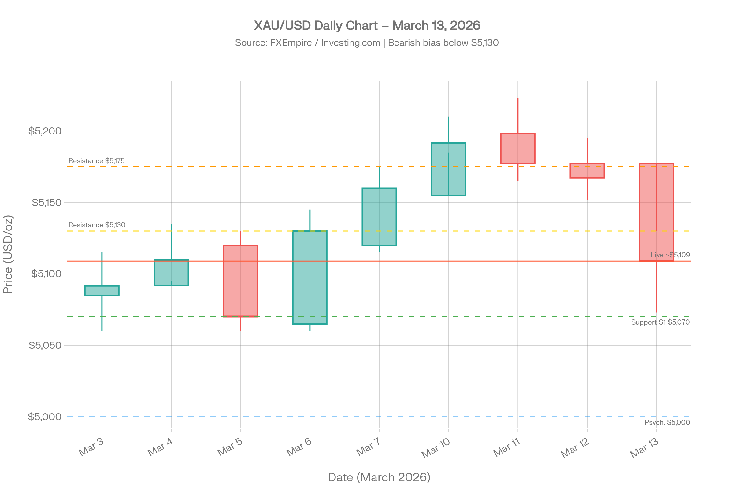 - March 13 (Today): Opened sharply lower near $5,073–$5,109, printing a bearish gap-down from the previous close — the most decisive bearish candle of the week