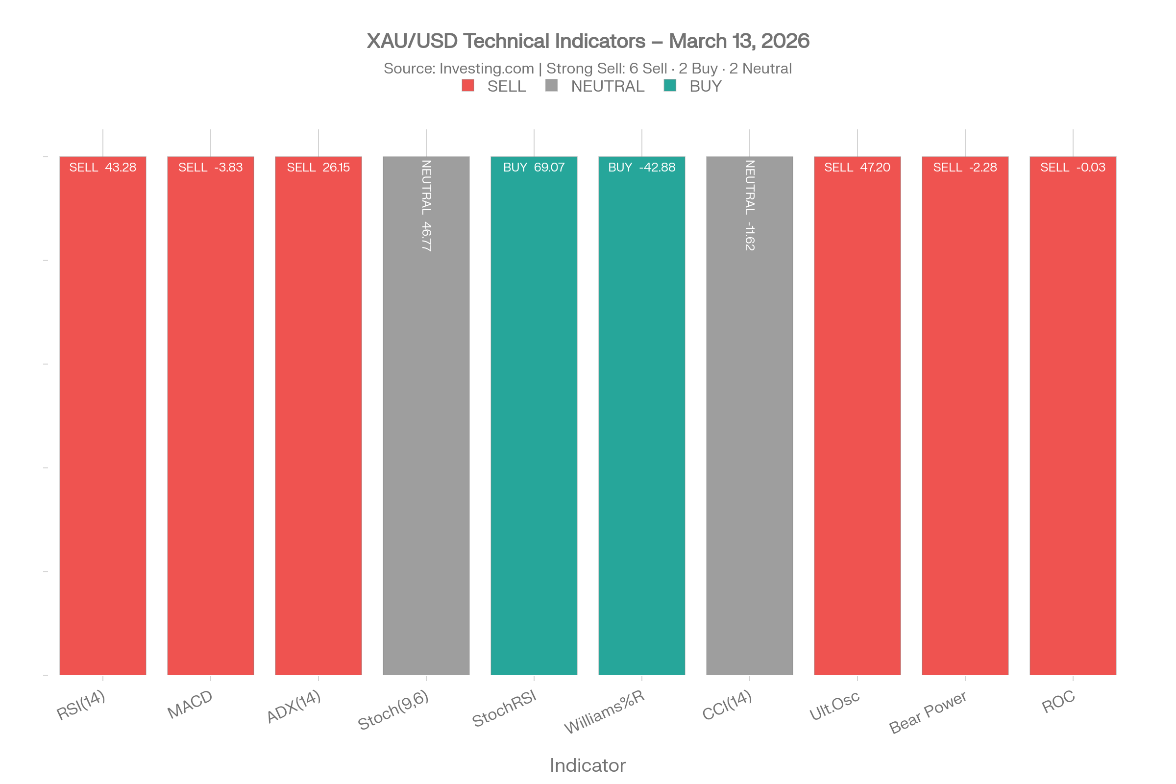 The technical picture on the daily chart is dominated by bearish signals, with 6 out of 10 key indicators reading SELL as of market open on March 13: